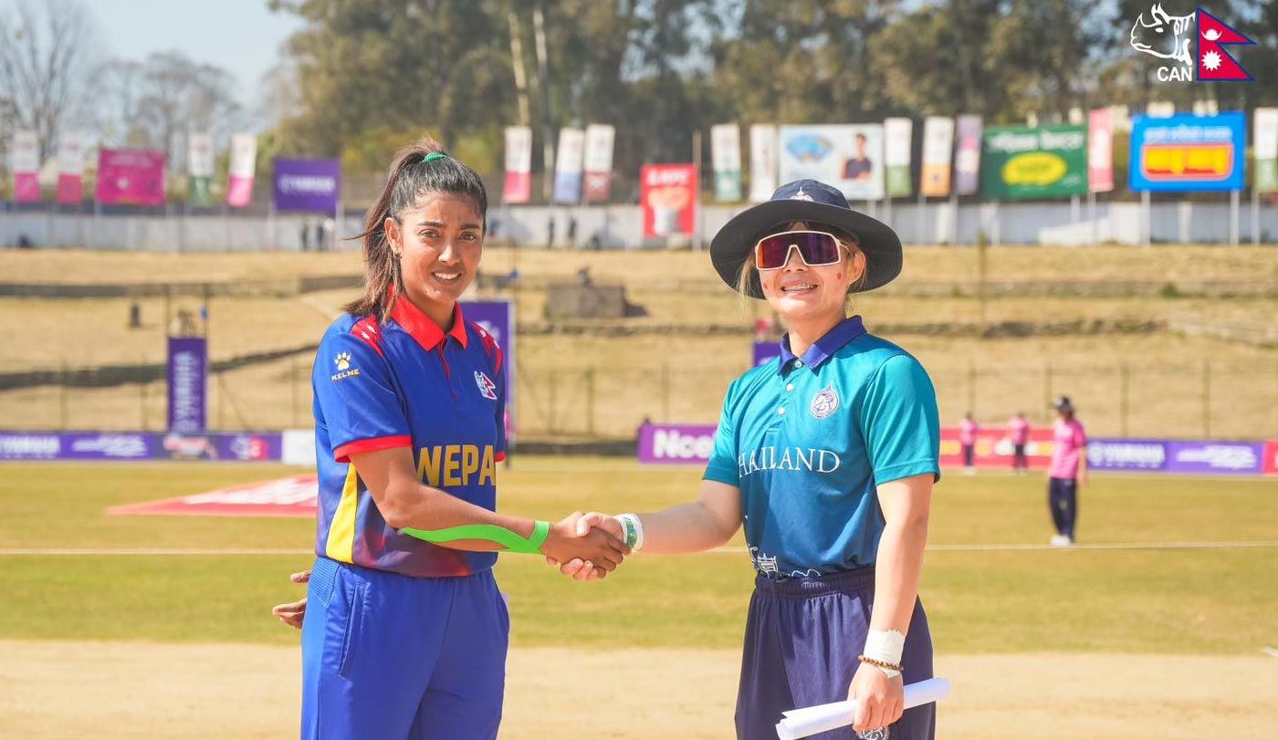 काठमाडौं । महिला त्रिकोणात्मक टी–२० आई सिरिजको अन्तिम खेलमा थाइल्याण्डविरुद्ध नेपालले टस जितेको छ ।कीर्तिपुरस्थित त्रिवि क्रिकेट मैदानमा टस जितेर नेपालकी कप्तान इन्दु बर्माले ब्याटिङ रोजेकी छिन् । यसअघि पाँच खेलमा हार व्यहोरेको नेपालले आज अन्तिम खेल थाइल्याण्डविरुद्ध खेल्न लागेको हो ।