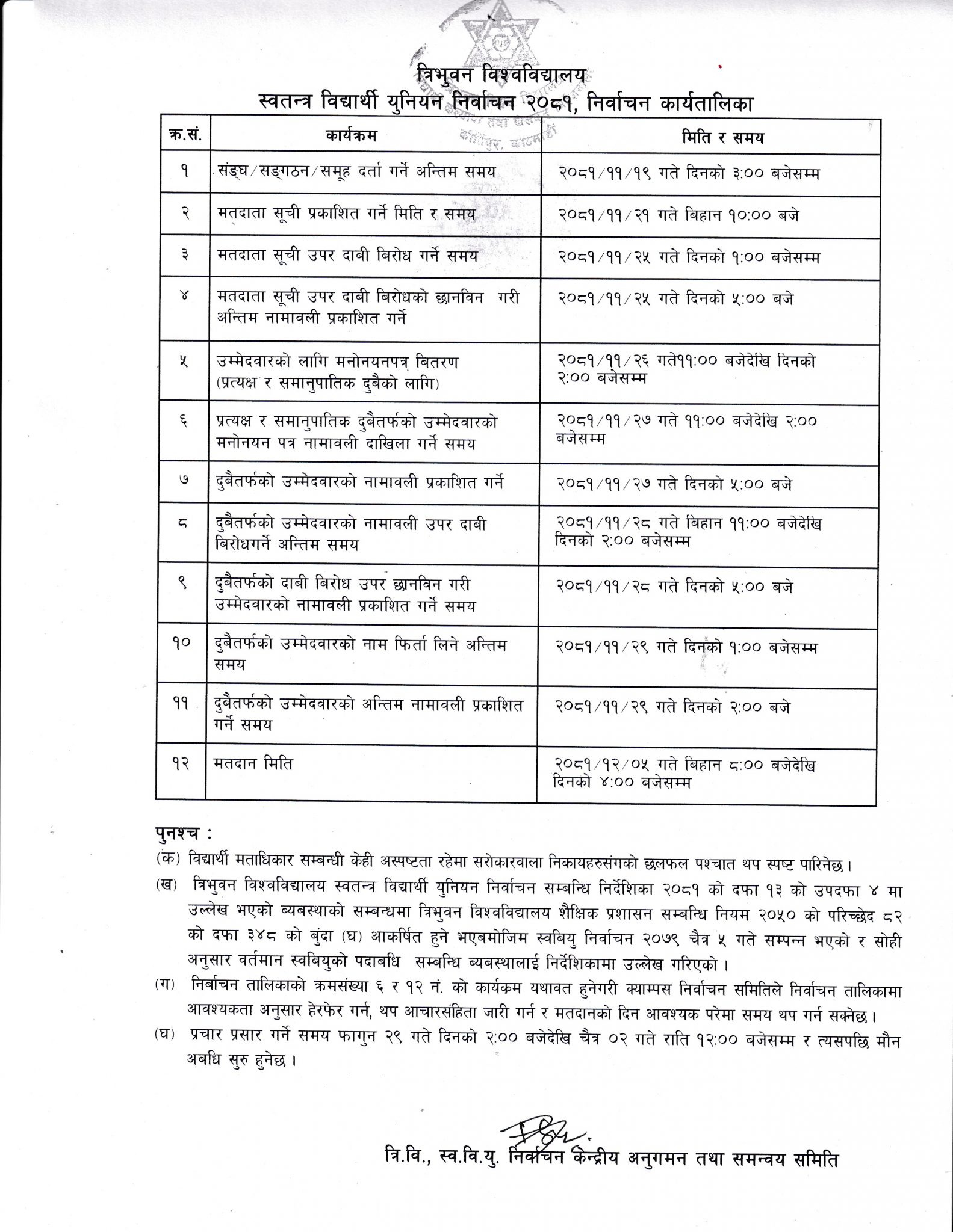 काठमाडौं । त्रिभुवन विश्वविद्यालयले स्वतन्त्र विद्यार्थी युनियन(स्ववियु)को निर्वाचनको तालिका सार्वजनिक गरेको छ । त्रिविले चैत ५ गते हुने स्ववियु निर्वाचनको तालिका सार्वजनिक गरेको हो । निर्वाचन तालिका अनुसार संघ संगठन, समूह दर्ता गर्ने अन्तिम समय फागुन १९ गते दिइएको छ । २१ गते मतदाता सूची प्रकाशन गरिनेछ ।त्यस्तै २७ गते उम्मेदवारी दर्ता गर्न सकिने जनाइएको छ । त्यस्तै उम्मेदवारहरूको लागि चैत २ गते राती १२ बजेपछि मौन अवधि लागू हुनेछ भने चैत ५ गते बिहान ८ बजेदेखि दिउँसो ४ बजेसम्म मतदान हुनेछ ।
