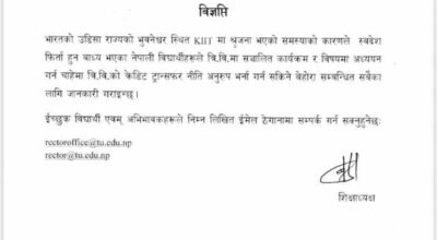 ‘भारतको उडिसा राज्यको भुवानेश्वस्थित केआईआईटीमा सिर्जना समस्याको कारणले भएको स्वदेश फिर्ता हुन बाध्य भएका नेपाली विद्यार्थीले त्रिविमा संचालित कार्यक्रम र विषयमा अध्ययन गर्न चाहेमा त्रिवि क्रेडिट ट्रान्सफरनीति अनुरुप भर्ना गर्न सकिने छ’ विज्ञप्तिमा भनिएको छ ।