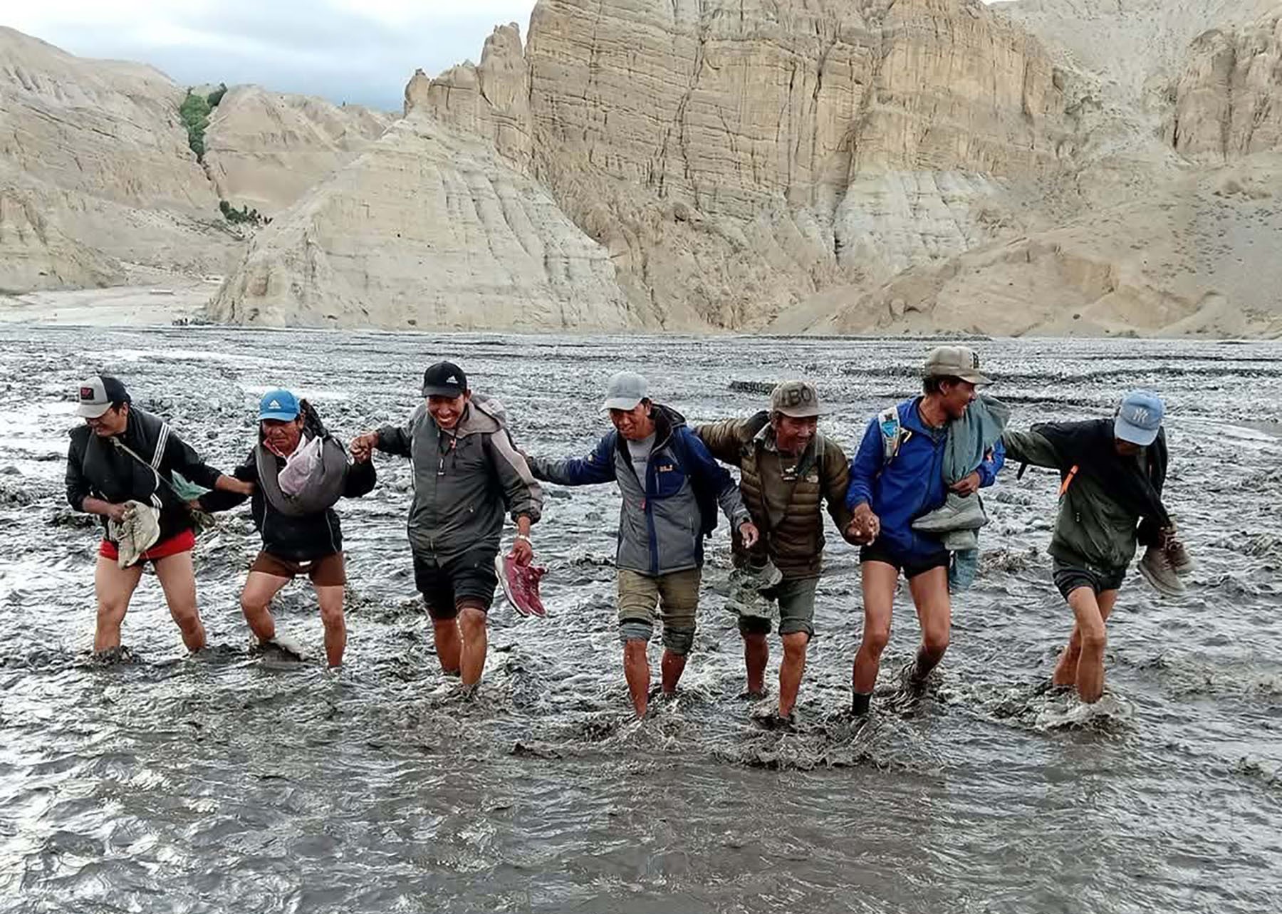 ‘ध्ये’ खोला तर्दै स्थानीय मुस्ताङ, २३ चैत : मुस्ताङको लोघेकर दामोदरकुण्ड गाउँपालिकास्थित ‘ध्ये’ खोलामा एक आपसमा हात समातेर खोला तर्दै स्थानीय । पुल नहुँदा ध्ये र ताङ्गा गाउँसहित त्यसक्षेत्र हुँदै मनाङ जाने पर्यटकलाई समेत निकै सास्ती हुने गरेको छ । तस्बिर : सुन्दरकुमार थकाली/रासस