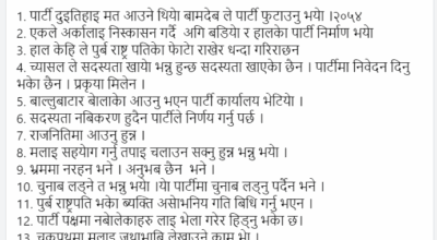 काठमाडौं । नेकपा ९एमाले० का अध्यक्ष तथा प्रधानमन्त्री केपी शर्मा ओलीले विधान महाधिवेशनका प्रतिनिधिलाई बुधबार साँझ बालुवाटारमा प्रशिक्षण दिएका छन्। काठमाडौंका प्रतिनिधिहरूलाई सम्बोधन गर्दै ओलीले पार्टीभित्रको आन्तरिक शक्ति संघर्ष र आफ्नो नेतृत्वबारे स्पष्ट धारणा राखे। प्रशिक्षणको संयोजन नेता रामेश्वर फुँयालले गरेका थिए भने काठमाडौं जिल्ला अध्यक्ष दीपक निरौलाले सामाजिक सञ्जालमार्फत प्रशिक्षणका ४८ बुँदा सार्वजनिक गरे। ओलीले पूर्वराष्ट्रपति विद्यादेवी भण्डारीलाई आफ्नो मुख्य प्रतिस्पर्धीको रूपमा उल्लेख गर्दै उनको गतिविधिप्रति आक्रोश व्यक्त गरे।