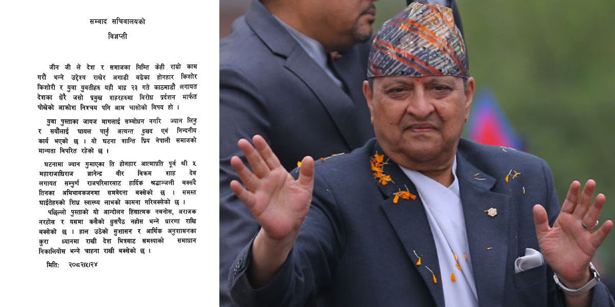 अन्तिम राजाका रुपमा रहेका शाहका तर्फबाट संवाद सचिव डा. फणिराज पाठकले वक्तव्य जारी गरी यस्तो जानकारी दिएका हुन्। वक्तव्यमा शाहले मृतक जेनजी पुस्ताप्रति श्रद्धाञ्जली, घाइतेलाई स्वास्थ्यलाभको कामना गरेका छन्।