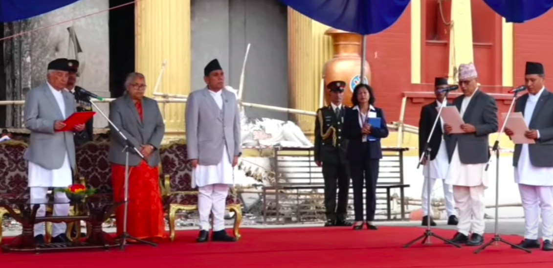 काठमाडौ । प्रधानमन्त्री सुशीला कार्की नेतृत्वको मन्त्रिमण्डल विस्तार भएको छ। सोमबार रामेश्वर खनाल, कुलमान घिसिङ र ओमप्रकाश अर्याल गरी ३ जनाले शपथ लिएका हुन्। तर, राष्ट्रपति निवास शीतल निवासमा आयोजित शपथ समारोहमा एउटा रोचक दृश्य देखियो। प्रधानमन्त्री कार्कीको शपथ समारोहमा नगएका राष्ट्रिय सभा अध्यक्ष नारायण दाहाल मन्त्रीहरूको शपथमा उपस्थित भए।