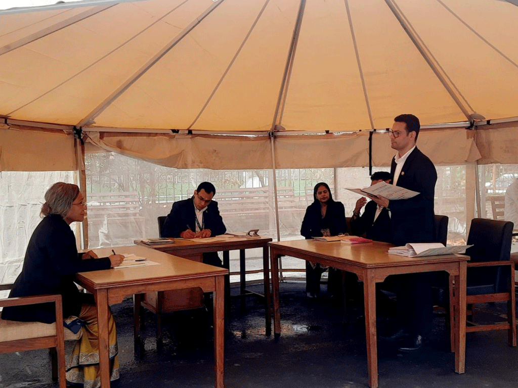 कर्मचारी बस्ने ठाउँ छैन । धेरै कर्मचारीको मुहार अझै खुल्न सकेको छैन । असरल्ल जलेको गाडीकै अगाडि एक छेउमा पाल टाँगिएको छ । पालमुनि काठका टेबल कुर्सी राखेर एकातर्फ न्यायाधीश र अर्को तर्फ कानुन व्यवसायी, अनि बिचमा इजलास अधिकृत बस्ने व्यवस्था गरी आजदेखि इजलास सञ्चालन गरिएको छ ।