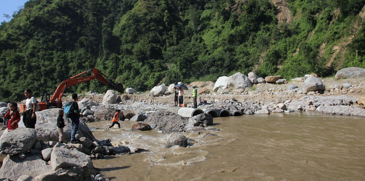 यात्रुले करिब १५ मिनेट पैदल यात्रा गरेर खोला पार गर्दै आएका छन् । गत बिहीबारदेखि डाइभर्सन र पहुँच मार्ग निर्माणको काम भइरहेको छ । गत वर्षको असोज १२ गते आएको बाढीले यहाँ रहेको सडक पुल बगाएको थियो । सडक पुल बगेपछि यहाँ अस्थायी डाइभर्सनबाट यातायात सञ्चालन हुँदै आएकोमा गत जेठमा स्थायी डाइभर्सन निर्माण गरिएको थियो ।