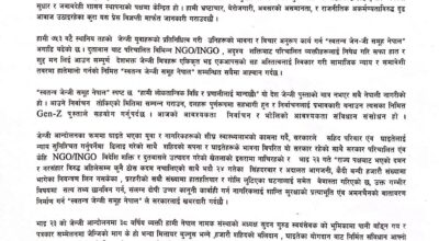काठमाडौं । भदौ २३ को जेनजी आन्दोलनमा पानी बाँड्न गएको भन्ने र विदेशी एजेन्सीको शंकास्पद एजेन्टका रूपमा काम गर्ने व्यक्तिले अन्तरिम सरकार आन्दोलनका उपलब्धि कब्जा गर्न खोजेको भन्दै स्वतन्त्र जेनजी समूहले आपत्ति जनाएको छ ।