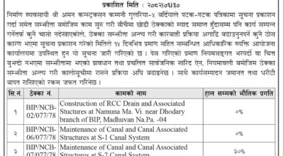 एउटाको ३० र अर्कोको ५५ प्रतिशत प्रगति छ । ऊर्जा, जलस्रोत तथा सिँचाइ, भौतिक पूर्वाधार तथा यातायात र शहरी विकास मन्त्री कुलमान घिसिङले ठेक्का लिने तर काम नगर्ने र आयोजना अलपत्र पार्ने प्रवृत्ति अन्त्यका लागि रुग्ण ठेक्का तोड्न मातहतका निकायलाई निर्देशन दिएका थिए । आयोजनाले पटक–पटक सूचना प्रकाशन गर्दासमेत सम्झौता बमोजिम काम सुरु नगरी बीचैमा छोडी ठेक्काको म्याद समाप्त हुँदासम्म पनि काम सम्पन्न गर्नेतर्फ कुनै जासो नदिएको जनाएको छ । ठेक्का सम्झौता अन्त्य गरी कारबाहीको प्रक्रिया अगाडि बढाउनुपर्ने कुनै ठोस कारण भएमा १५ दिनभित्र प्रमाणसहित सम्बन्धित आधिकारिक व्यक्ति आयोजना कार्यालयमा उपस्थित हुन सूचना जारी गरिएको छ ।