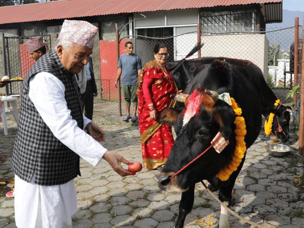 राष्ट्रपति पौडेलले शीतल निवासमा विधिपूर्वक गाईको पूजा गरी गाईलाई खानेकुरा खान दिएको राष्ट्रपतिको सचिवालयले जनाएको छ ।