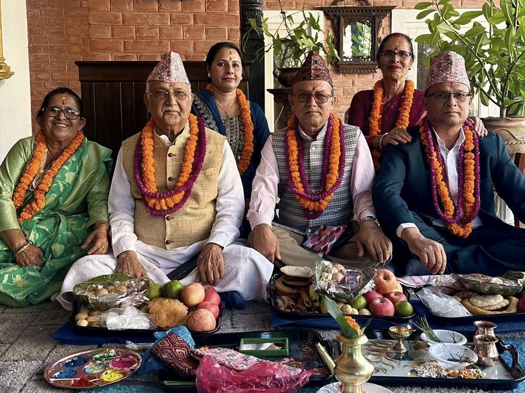 काठमाडौँ। नेकपा (एमाले) का अध्यक्ष तथा पूर्व प्रधानमन्त्री केपी शर्मा ओलीले बहिनीहरूको हातबाट शुभ साइतमा २०८२ सालको तिहारको टीका ग्रहण गरेका छन् ।