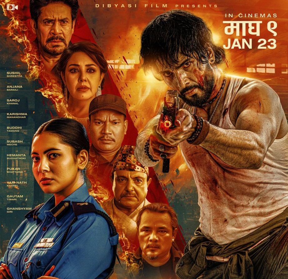 अभिनेता सुशील श्रेष्ठलाई एक्सन अवतारमा प्रस्तुत गर्दै पोस्टरमा घाइते अवस्थामा रहेका सुशील दुश्मनमाथि बन्दुक तानेर उभिरहेका छन्, जसले उनको पात्र परिवर्तनका लागि सर्वस्व झोक्न तयार रहेको संकेत गर्छ । अभिनेत्री अञ्जना बराइली इन्स्पेक्टरको भूमिकामा छिन् । उनको नजरले अपराध अनुसन्धानमा जिम्मेवारी र न्यायप्रतिको प्रतिवद्धता झल्काउँछ । सरोज खनाल, करिश्मा मानन्धर, बुद्धि तामाङ, हेमन्त बुढाथोकी र सुवास मेचेलाई पनि पोस्टरमा उतारिएको छ।