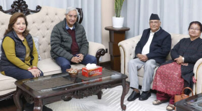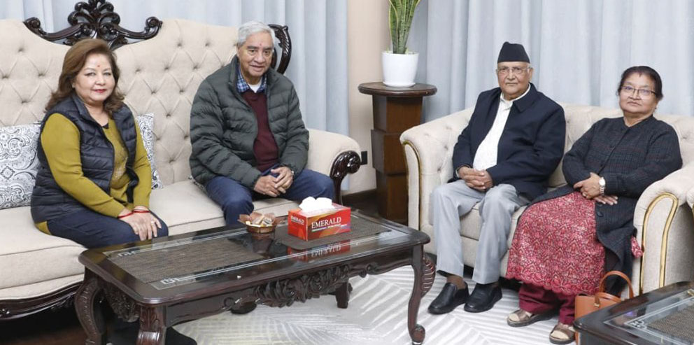 गत भदौ २३ र २४ को जेनजी आन्दोलनपछि ओली र देउवा पहिलो पटक प्रत्यक्ष भेटवार्ता भएको हो। देउवा भेट्न एमाले अध्यक्ष ओली पत्नी राधिका शाक्यलाई लिएर महाराजगञ्ज पुगेका थिए। देउवासँग उनकी धर्मपत्नी कांग्रेस नेतृ डा.आरजु राणा पनि सहभागी छन्।