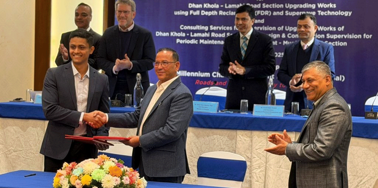 सोमबार काठमाडौँमा एमसीए-नेपालले एमसीसी नेपाल कम्प्याक्ट अन्तर्गतको सडक मर्मत आयोजना कार्यान्वयन क्रममा पूर्व-पश्चिम राजमार्गको धान खोलादेखि लमहीसम्मको सडक खण्डमा ‘फुल डेप्थ रिक्लेमेसन तथा सुपरपेभ प्रविधि’ प्रयोग गरेर सडक स्तरोन्नति कार्यका लागि सम्झौता गरेको हो ।