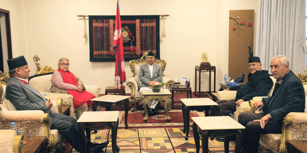 अहिले राष्ट्रपति पौडेल, काँग्रेसका सभापति शेरबहादुर देउवा, नेकपा एमालेका अध्यक्ष केपी शर्मा ओली र नेपाली कम्युनिस्ट पार्टीका संयोजक पुष्पकमल दाहाल ‘प्रचण्ड’छलफलमा छन् ।