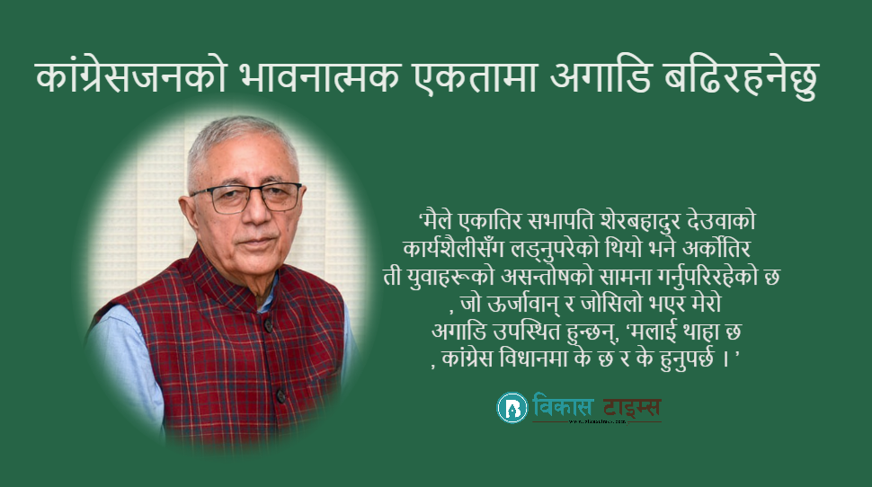 यस क्रममा मैले एकातिर सभापति शेरबहादुर देउवाको कार्यशैली सँग लड्नु परेको थियो भने अर्कोतिर ती युवाहरूको असन्तोषको सामना गर्न परिरहेको छ, जो ऊर्जावान् र जोसिलो भएर मेरो अगाडि उपस्थित हुन्छन् । मलाई थाहा छ, कांग्रेस विधानमा के छ र के हुनुपर्छ । मैले कांग्रेस विशेष महाधिवेशनको अभियान चलिरहँदा आफ्नो मत केन्द्रीय कार्यसमितिमा लिखित रूपमै राखेको छु । मैले यो राखिरहँदा कांग्रेसमा कुनै कतै कुनाबाट पनि विभाजनको प्राविधिक र भावनात्मक सन्देश प्रवाह नहोस् भनी सतर्क थिएँ ।
