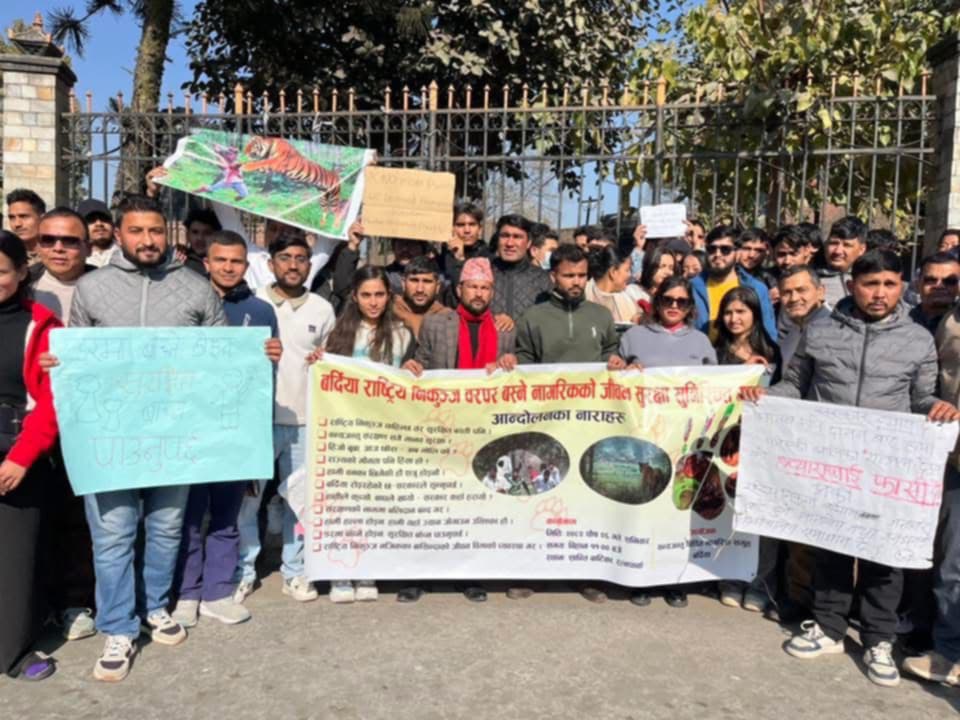 बर्दिया । बर्दिया जिल्ला लगायत विभिन्न जिल्ला मा पछिल्लो समय बाघले मध्यवर्ती र सामुदायिक वन आसपासका बस्तीमा दिनदहाडै आक्रमण गरी ज्यान जाने क्रम निरन्तर छ ।     काठमाडौं को शान्तिवाटिका मा सरकारलाई दबाबमूलक शान्तिपूर्ण र्‍याली निकालेर सम्बन्धित निकायलाई खबरदारी कार्यक्रम भएको छ संरक्षणसँगै जनताको जीवन र सम्पत्तिको सुरक्षा सुनिश्चित गर्नु सरकारको दायित्व हो। रानीपोखरी को परिक्रमा पछी को कोण सभा मा आफ्नो भनाई राख्ने वक्ताहरु ले जनता को सुरक्षा पहिलो कर्तव्य हो भन्ने आवाज उठाउनु भएको छ ।