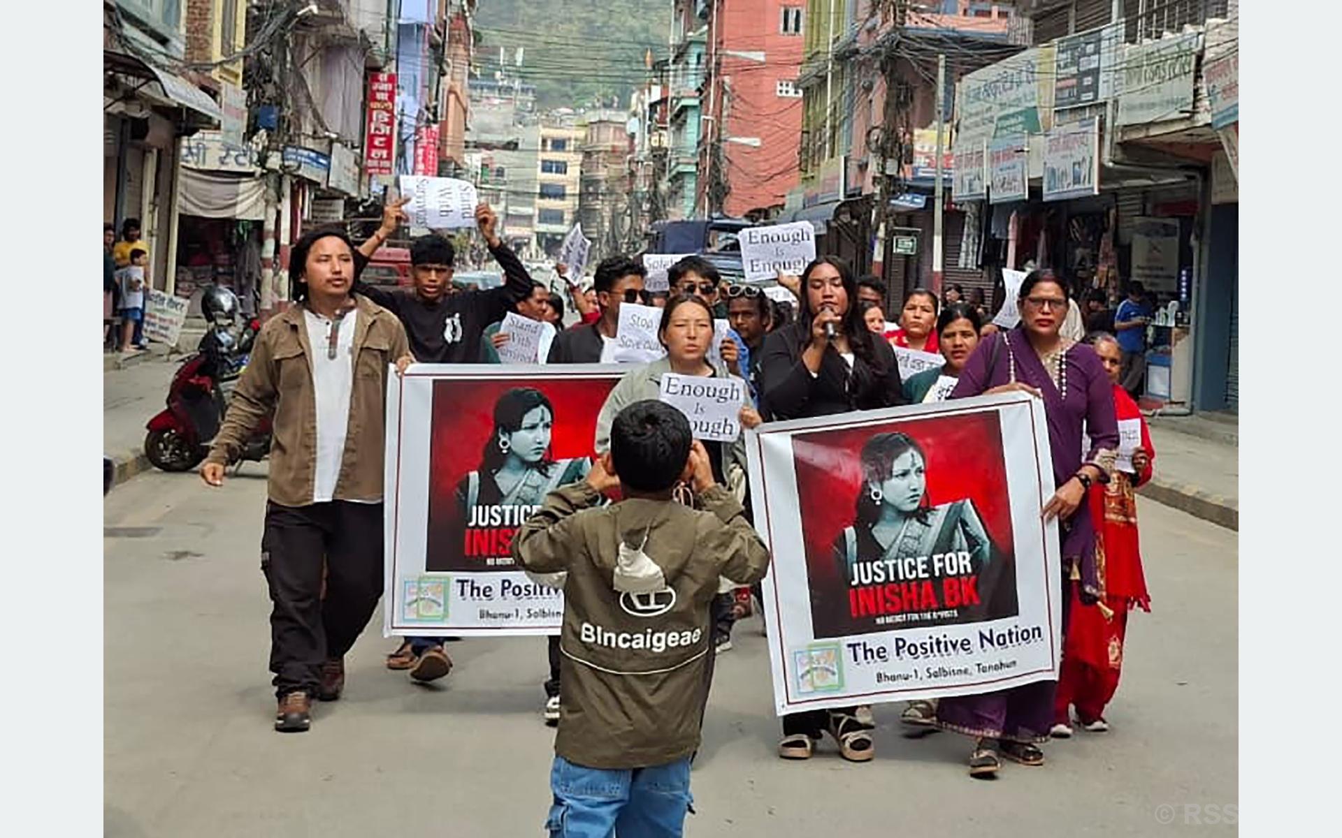 काठमाडौँ । इनिशा विक हत्या प्रकरणका दोषीलाई कडा कारबाहीको माग गर्दै युवाहरूले शनिबार पनि काठमाडौँमा विरोध प्रदर्शन गरेका छन् । इनिशा विक हत्या प्रकरणको निष्पक्ष छानबिन गर्दै दोषीलाई कडा भन्दा कडा कारबाहीको माग गर्दै युवाहरूको एक समूहले शनिबार काठमाडौँको माइतीघरदेखि बानेश्वरसम्म विरोध प्रदर्शन गरेका हुन् । उनीहरुले बलात्कारीलाई फाँसी दिने कानुन बनाउन माग गरेका छन् ।