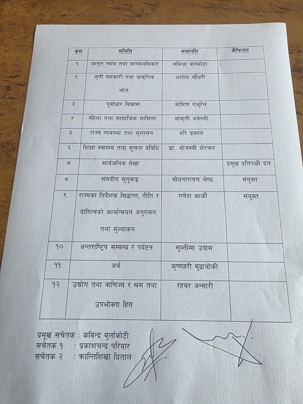 रास्वपाबाट समीक्षा बाँस्कोटा, अशोक चौधरी, आशिष गजुरेल, आकृती अवस्थी, हरि ढकाल, ओजस्वी शेरचन, वोधनारायण श्रेष्ठ, गणेश कार्की, सुन्निमा उदास, कृष्णहरि बुढाथोकी र रहवर अन्सारी संसदीय समितिका सभापति हुने भएका हुन् ।