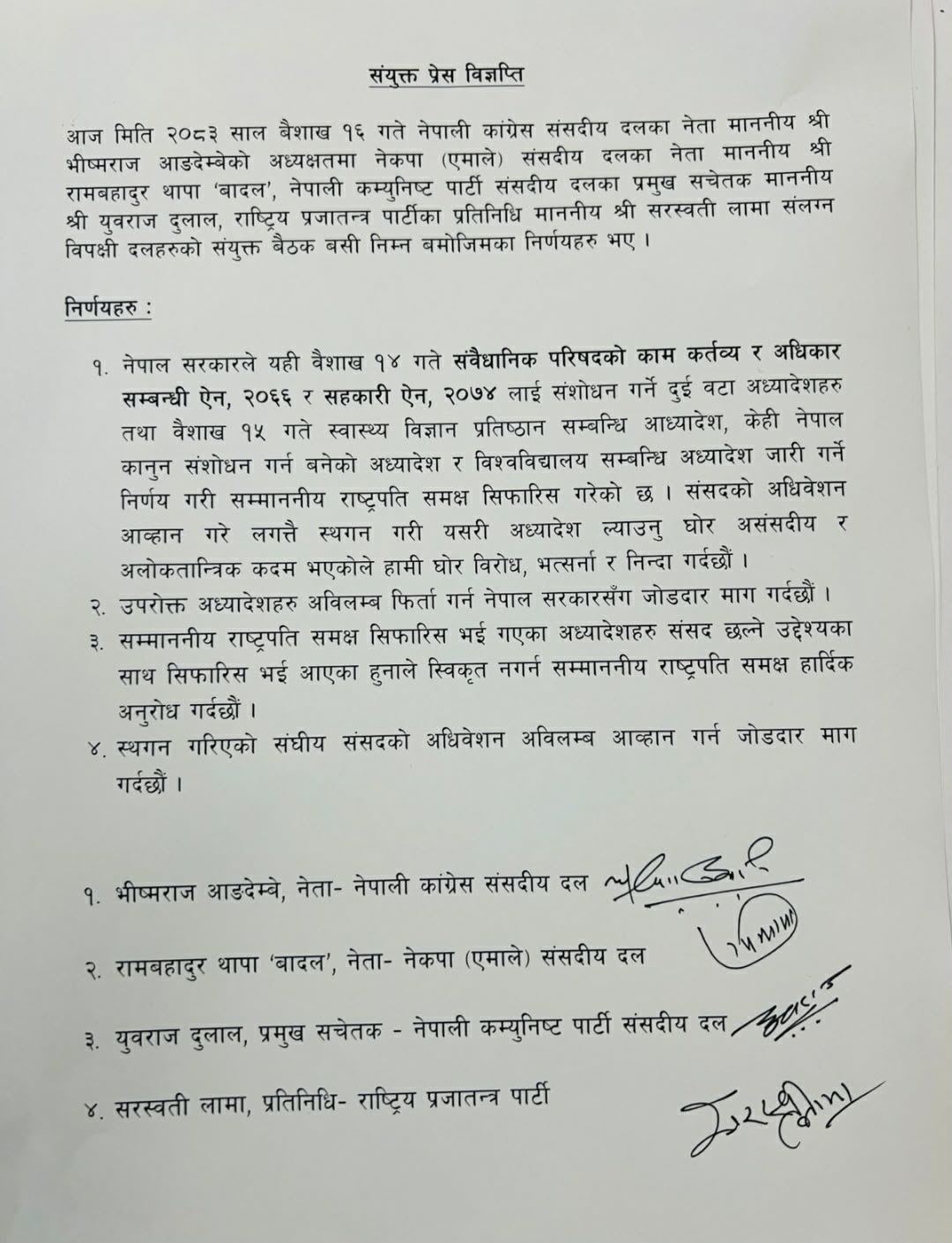 बुधबार सिंहदरबारस्थित नेपाली कांग्रेस संसदीय दलको कार्यालयमा बसेको विपक्षी दलको बैठकले संसद् छलेर अध्यादेश ल्याउन सरकारको कार्यको विरोध गर्दै फिर्ता लिनसमेत आग्रह गरेको छ । सरकारले सोमबार संवैधानिक परिषद्सम्बन्धी र सहकारी समस्यासम्बन्धी अध्यादेश जारी गर्न राष्ट्रपतिसमक्ष पेश गरेको थियो ।