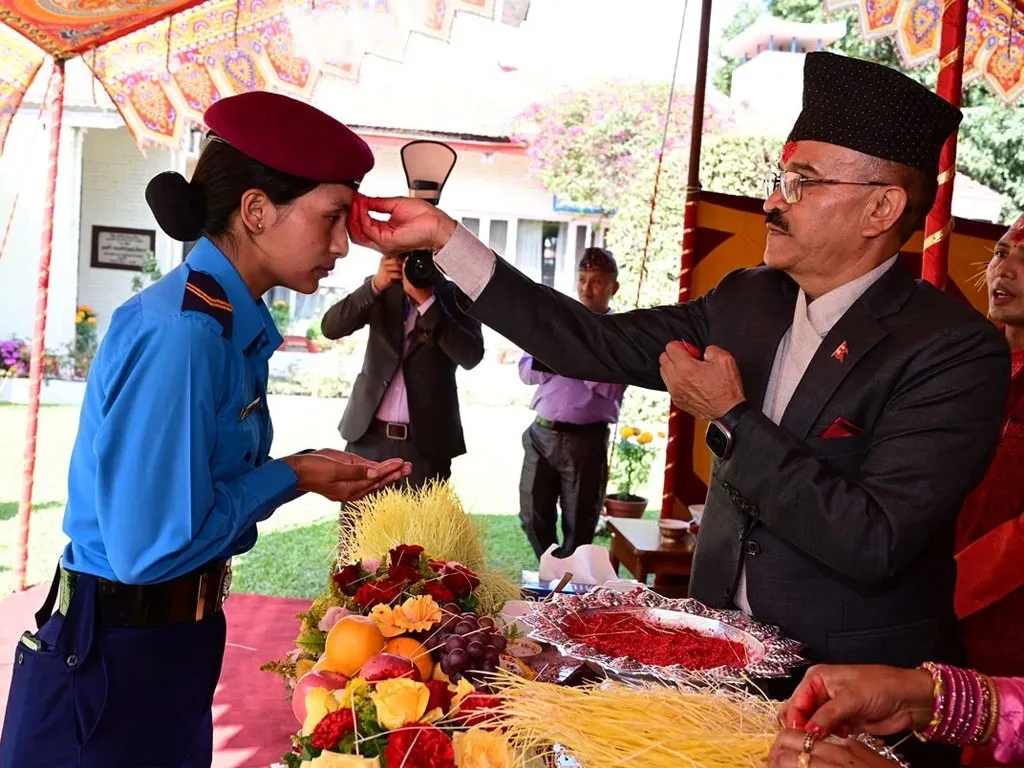 काठमाडौँ । प्रहरी महानिरीक्षक बसन्त बहादुर कुँवरले बडादसैँ २०८१ को अवसरमा आइतबार सकल दर्जाका प्रहरी कर्मचारीहरूलाई टीका लगाइदिएका छन् । नेपाल प्रहरी प्रधान कार्यालयस्थित प्रहरी महानिरीक्षकको निवासमा उपस्थितहरूलाई प्रहरी महानिरीक्षक कुँवरले टीका तथा जमरा लगाइदिनुका साथै सुख, समृद्धि एवम् उत्तरोत्तर प्रगतिको कामना समेत गरे । उक्त अवसरमा नेपाल प्रहरी श्रीमती संघकी अध्यक्ष लक्ष्मी कुँवरले टीका…