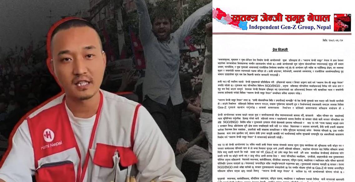 काठमाडौं । भदौ २३ को जेनजी आन्दोलनमा पानी बाँड्न गएको भन्ने र विदेशी एजेन्सीको शंकास्पद एजेन्टका रूपमा काम गर्ने व्यक्तिले अन्तरिम सरकार आन्दोलनका उपलब्धि कब्जा गर्न खोजेको भन्दै स्वतन्त्र जेनजी समूहले आपत्ति जनाएको छ । स्वतन्त्र जेनजी समूहका संयोजक तथा आन्दोलनको घाइते समेत रहेका रुपेन्द्र दाहालले वक्तव्य जारी गर्दै वास्तविक जेनजीलाई ओझेलमा पारेर सुधन गुरुङजस्ता…