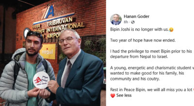 काठमाडौँ । गए राति काठमाडौँको तीनकुनेमा मोटरसाइकल दुर्घटना हुँदा एक युवाको मृत्यु भएको छ । काठमाडौँ महानगरपालिका-३२ तीनकुनेस्थित सडकमा बा६८प ४१५३ नम्बरको मोटरसाइकल अनियन्त्रित भई दुर्घटना हुँदा मोटरसाइकल चालक कैलाली गोदावरी गाउँपालिका-८ घर भई काठमाडौँको बानेश्वर बस्ने २१ वर्षीय समिर चौधरीको मृत्यु भएको हो । दुर्घटनामा गम्भीर घाइते चौधरीको उपचारका क्रममा काठमाडौँ मेडिकल कलेज सिनामंगलमा…